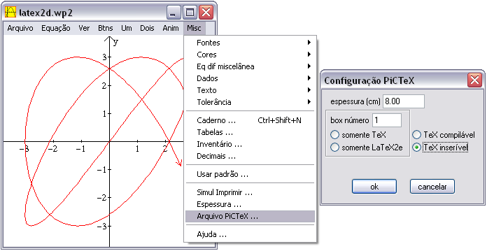 Para gerar o arquivo PiCTeX (comandos do LaTex para gerar figuras) a ser incluído no arquivo, basta escolher a opção Misc/Arquivo PiCTex, escolher o nome do arquivo, nesse exemplo, latex2d.tex, escolher o tamanho em centímetros da figura, e escolher, na minha opinião, a opção TeX inserível como mostra a figura abaixo.