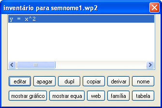 Este ítem permite que você defina sua própria biblioteca de funções, que são salvas com o arquivo. Quando o Winplot analisa uma expressão, ele olha para a sua lista de funções primeiro. Para fazer uma entrada nova na lista, digite o nome na primeira caixa de edição e uma fórmula que a defina (em termos de x) no segundo. Clique "enter" para terminar.