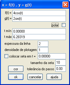 Para definir as funções em coordenadas paramétricas, basta clicar em Equação/Paramétricas, surgindo a seguinte janela:
