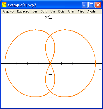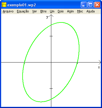 Funções definidas implicitamente são desenhadas por um método especial. O programa procura aleatoriamente por um ponto inicial que se encaixa na equação dada. Uma vez que este ponto é encontrado, a curva a partir deste ponto é desenhada ao se calcular numericamente certas equações diferenciais. Tendo em vista que o gráfico desenhado pode não ser conexo (não ter um só pedaço), o programa demora mais tempo procurando por mais pontos iniciais. Se você desejar continuar a busca até pressionar Q para parar, selecione a caixa "procura longa" . Este modo só funciona para desenhos que são realizados após você clicar OK -- não se aplica se a tela tem que ser redesenhada (depois de uma mudança de tamanho, por exemplo). Se você quer ver o andamento do processo de desenho na tela (que será mais lento, se você escolher isto), selecione "ver". Este modo permanece ativo sempre que a janela é atualizada. Veja o resultado do exemplo: