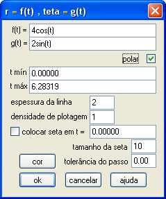 Para definir as funções polares, basta clicar em Equação/Polares, surgindo a seguinte janela: