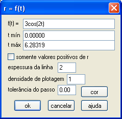 Use esta caixa para curvas polares e use a letra t para representar o ângulo polar teta, que é dado em radianos. O domínio padrão é de 0 a 2pi. Se você não quiser representar valores de r negativos selecione a caixa.