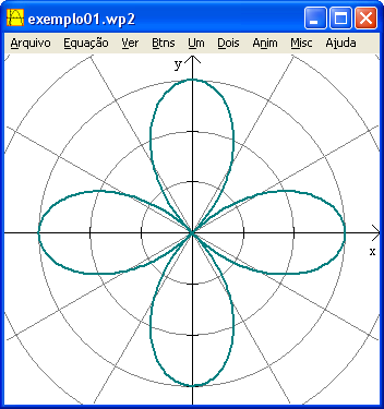 Você provavelmente desejará alterar a variação dos valores de t, e pode ser necessário aumentar a densidades dos pontos caso a curva pareça muito "poligonal". Marque "polar" para entrar com equações paramétricas no sistema polar, dadas por equações que definem r e teta em função de um parâmetro t, como mostrado abaixo: