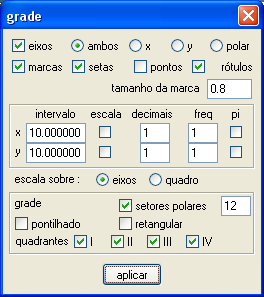 Nessa janela pode se definir o que visualizar como: eixos, setores, marcas, setas, tamanho das marcas, rótulos, qual quadrante, se vai ter grade e outros detalhes a mais, que são úteis, para melhor compreensão do gráfico.