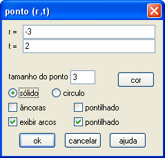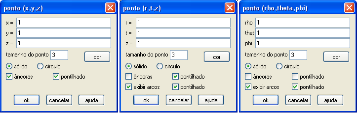 Existem quatro formas de se marcar um ponto com o Winplot, para tanto basta clicar em Equação/Ponto,e escolher em qual sistema de coordenadas que se marcar o ponto, ou seja, coordenadas cartesianas, cilíndrico (pode ser útil mostrar também o Meridiano principal, cuja posição pode ser alterada).