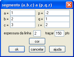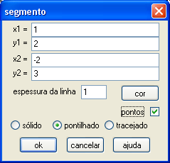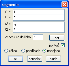 De maneira análoga a de se marcar dois pontos, tem-se também a possibilidade de se marcar segmentos em coordenadas cartesianas ou polares, para tanto basta clicar em Equação/Segmento/(x,y) ou Equação/Segmento/(r,t), tendo a opção de se criar os dois pontos da extremidade dos segmentos, como mostra o exemplo abaixo