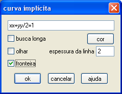 Para curvas definidas implicitamente, basta clicar em Equação/Implícitas, surgindo a seguinte janela: