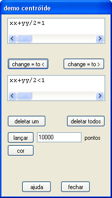 Esta caixa está disponível somente se existirem exemplos de curvas implícitas no inventário. Uma equação f(x,y)=0 pode ser convertida numa inequação: basta selecionar a equação na primeira caixa de listagem e clicar num dos botões "alterar". Uma região plana será definida pelas inequações da segunda caixa de listagem (tomadas conjuntamente). Clique em "lançar" para preencher a região com pontos aleatórios uniformemente distribuídos. A média desses pontos é uma aproximação do centróide da região. A amostra inclui apenas os pontos visíveis. Pressione qualquer tecla para interromper a geração dos pontos.