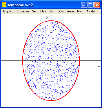 No exemplo abaixo está definida a equação de uma elípse xx + yy/2 =1 e marcado 10.000 pontos da inequação xx + yy/2 < 1