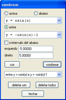 Cada uma dessas regiões são obtidas sombreando "acima" ou "abaixo" determinada curva, ou "entre" duas curvas selecionadas -- os botões selecionam apenas um dos três casos. Para restringir os valores de x entre dois extremos, selecione "definir intervalo" e digite os valores extremos no espaço apropriado. O sombreamento é feito por um padrão de pequenos pontos, cuja cor poderá ser selecionada. Uma vez descrita a região clique "sombrear" para ver o resultado e para adicionar na lista de regiões.