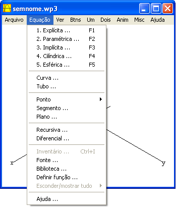 Para visualizar superfícies definidas implicitamente, basta clicar em Equação/Implícitas, surgindo a seguinte janela: