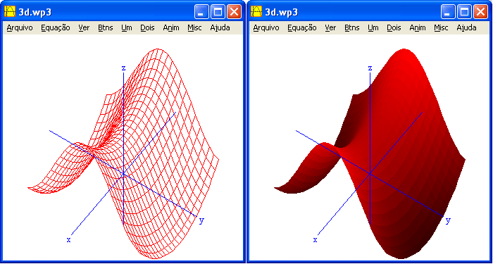 Para obter uma visualização rápida da superfície, clique em desenho rápido e para uma visualização mais suave, com o preenchimento das grades com tons da cor escolhida, que variam de acordo com a altura, vindo dos pontos mais inferiores (escuros) para os mais superiores (claros). Veja no exemplo abaixo, sem e com espectro.