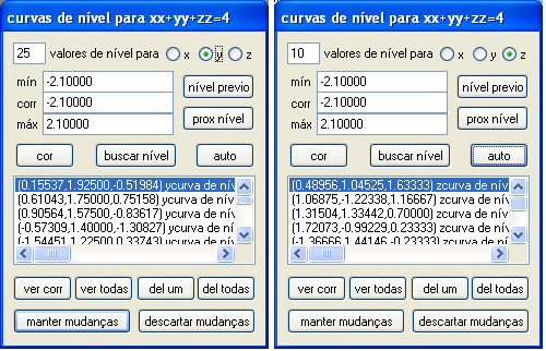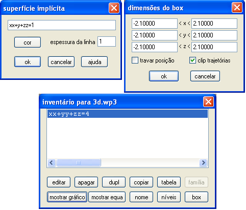 Superfícies definidas implicitamente são desenhadas por meio de curvas de níviel, que são obtidas clicando no botão níveis na janela inventário, bastando escolher qual das três variáveis será atribuidos valores, para a obtenção de curvas no espaço.