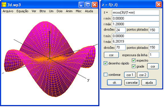 Como no exemplo acima, foi definido z=rrrcos(3t)/(1+rrrr), onde r=rô (módulo) e t=teta (ângulo polar em radianos). Nesse exemplo está usando espectro de uma cor e grade de outra.