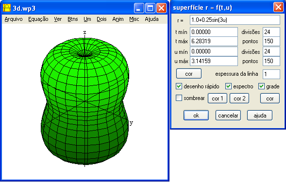 No exemplo acima, foi definido r=1.0+0.25sin(3u), onde t=teta e u=fi são ângulos em radianos.