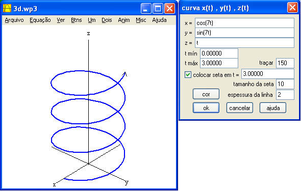 Onde a curva do exemplo acima, é definida parametricamente como x = f(t)=cos(7t), y = g(t)=sin(7t) e z = h(t)=t, com t variando no intervalo [0,3] e sendo colocada uma seta para t = 3