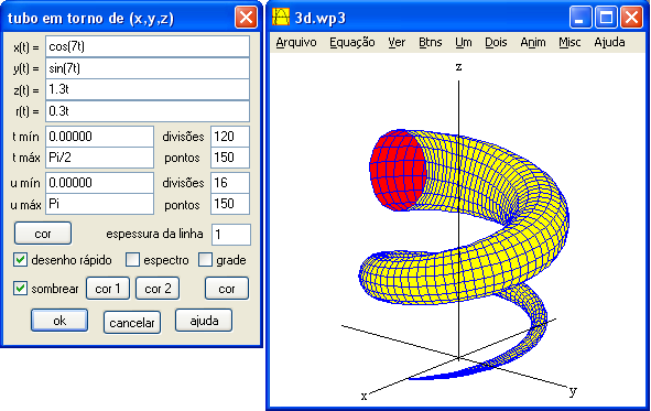 Para definir essa superfície tubular, basta clicar em Equação/Tubo, surgindo a seguinte janela: